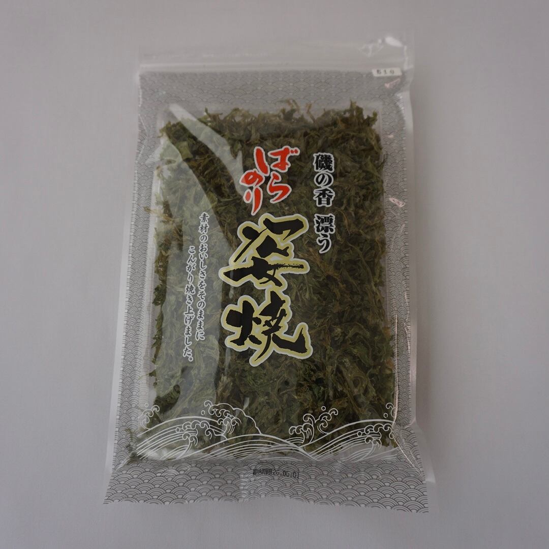 春一番採りを清水で洗い、塩分をほとんど抜いて衛生的に乾燥させ、おいしさを逃さない直火焼で仕上げています。海苔を成形するときにできる切れ端を集めたものです。